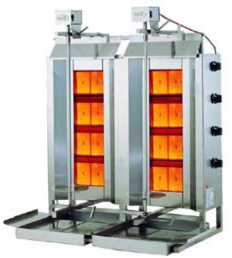 Döner etinin pişebilmesi için ete 450-550 ⁰C’lik bir ısının ulaşması gerekmektedir. Et döndürme sistemi manuel yada motorlu olabilir. Bazı modeller alt kısımdan döndürmeli ve kesilen döner etinin ısısının kaybolmaması için ek bir sıcak tutma sistemi ile donatılmıştır. Bu üründe genellikle pilot brülörüne ihtiyaç duyulmaz. . 7,5 kW’tan 19 kW’a kadar üretilebilirler. Gaz giriş bağlantı çapları genellikle R1/2” yada R3/4”’dir.